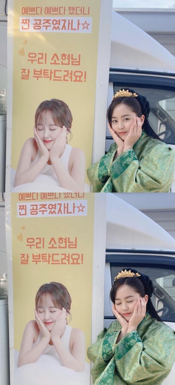 공개한 사진 속 김소현은 배너 속 '예쁘다 예쁘다 했더니 찐 공주였자나'라는 멘트처럼 평강공주로 변신해 커피차 배너 앞에서 포즈를 취하고 있다. 김소현은 배너 속 자신의 '꽃받침' 포즈를 재연하며 매력을 두 배로 뽐냈다.