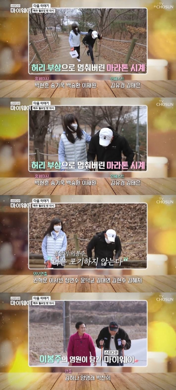 이봉주는 휠체어를 타는가 하면, 아내의 부축을 받으며 등산하는 등 재활치료를 시도하고 있었다. 이봉주의 어머니는 "(이봉주가) 허리가 구부러져서 지팡이를 짚고 다녔다"며 "그게 엄마 걱정이지 다른 거 걱정은 없어"라고 이봉주에 대한 안타까움을 토로했다.