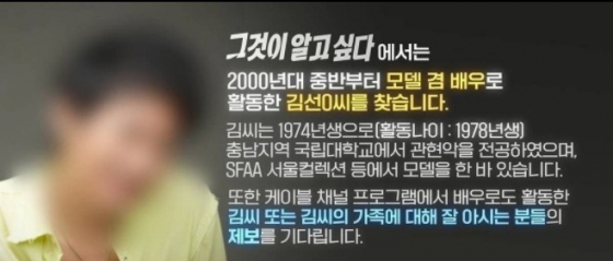 SBS '그것이 알고싶다'가 2000년대 중반부터 모델 겸 배우로 활동한 김선○를 공개적으로 찾는다.