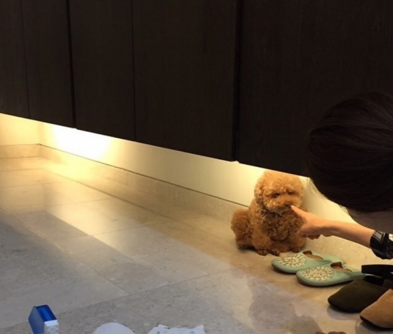 사진 속 최지우는 신발장 아래 들어가 있는 반려견을 혼내고 있다. 강아지의 잔뜩 작아진 몸과 시무룩한 표정은 보는 이들의 웃음을 자아낸다.
