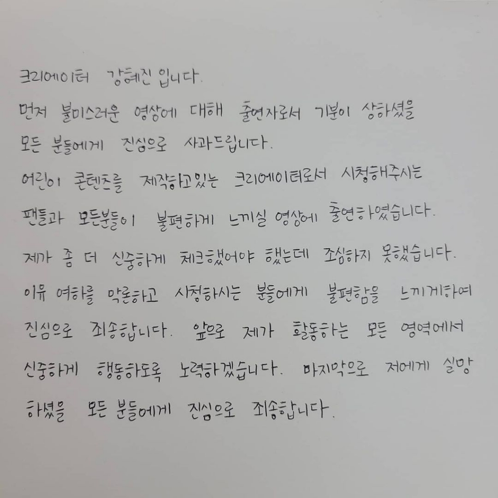 어린이 콘텐츠를 제작하고 있는 크리에이터로서 시청해주시는 팬들과 모든 분들이 불편하게 느끼실 영상에 출연하였습니다. 제가 좀 더 신중하게 체크했어야 했는데 조심하지 못했습니다.