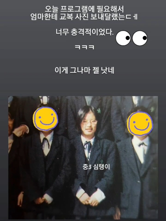 심진화는 25일 자신의 인스타그램 스토리에 "오늘 프로그램에 필요해서 엄마한테 교복 사진 보내달라고 했는데 너무 충격적이었다. 이게 그나마 제일 낫네"라는 글과 함께 사진을 게재했다.