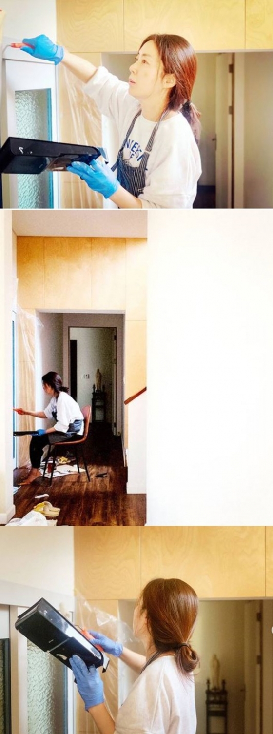 사진 속에는 송윤아가 스스로 집안 인테리어를 해내는 모습이 담겨 있다.