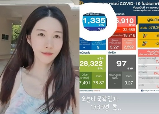 신주아는 14일 인스타그램 스토리에 "오늘 태국 확진자 1335명. 휴"라는 글과 함께 사진을 게재했다. 공개된 사진 속에는 하루 확진자 수 1355명을 기록한 태국 확진자 현황이 올라와 있다.