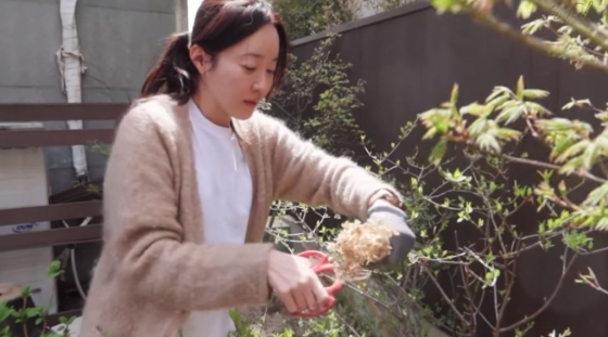 엄지원은 가드닝을 직접 하며 "정원 관리를 하나도 안 했다. 늦었을 때가 가장 빠를 때니까"라고 말학 수국 가지치기를 시작했다.