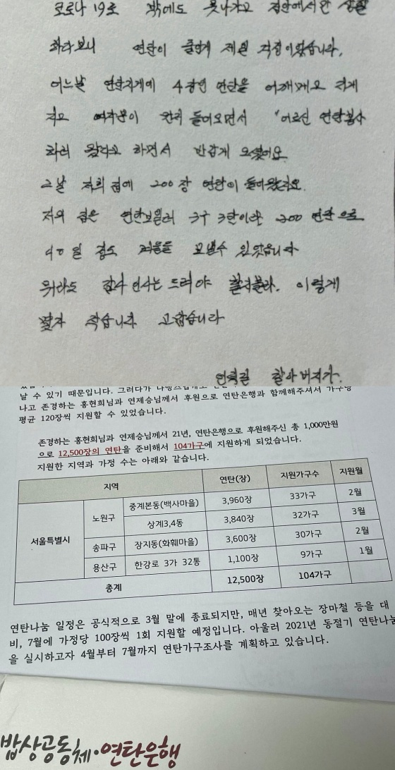제이쓴은 "우릴 부부 좋은 날 꼭 기부하지는 다짐으로 지난 겨울 연탄은행이 어렵다는 소식을 듣고 작게나마 도움이 되었으면 하는 바람으로 기부했는데 어르신이 보내주신 편지 때문에 샌드위치 먹다가 울뻔했네. 현희야 우리 더 열심히 살아서 기부 또 열심히 하자"라는 글을 사진과 함께 첨부했다.