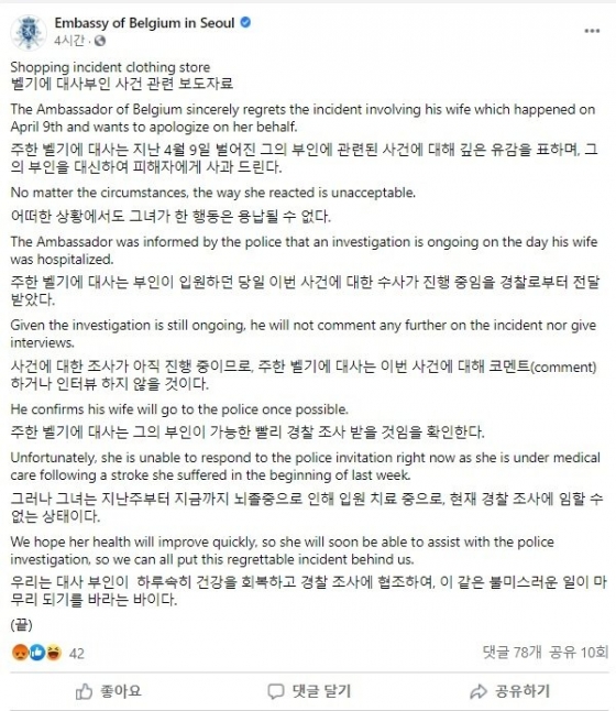 이번에 정말로 벨기에 사람으로 창피한 일이 생겼습니다. 생겨서 안 되는 일이 생겼습니다. 어떤 상황에서도 폭력을 쓰면 안 되고 대사님의 부인이라면 더더욱 더 안됐었다고 생각을 합니다. 그리고 일이 생길 때 상황 대처하는 것도 중요한데 사과문을 늦게 올렸고, 마지막에 (끝) 적혀있는 거 보고 한숨만 쉬었습니다. CCTV 없었다면 그냥 이 일이 넘어가지 않았을까를 생각하면서 공개돼서 천만다행이라고 생각을 합니다. 제가 벨기에인 이지만 벨기에 대사관이나 대사님을 대변할 수 있는 사람이 아니라서 처음에 뉴스에 보도됐을 때 어떻게 대응할까 지켜보고 있었는데 지켜보다가 저도 열 받고 글 남겨야겠다는 결심 하게 되었습니다. 지금 벨기에 뉴스에 보도되고 있어서 우리 부모님한테 전화 와서 이게 무슨 일이냐고 물어봤습니다. 벨기에 매체에 댓글 보면 말이 되냐, 창피하다, 등의 비판과 벨기에 이미지를 안 좋게 만들어서 책임져야 한다는 내용이 대부분입니다. 피해자와 피해자 가족에게 벨기에 국민으로서 벨기에 국민들을 대변하여 고개 숙여 사과드립니다.
