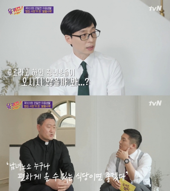 이문수 신부는 21일 tvN 예능프로그램 '유 퀴즈 온 더 블럭'에 출연했다. 이날 이문수 신부는 "메뉴는 김치찌개 한 가지다. 3000원을 받고 있다. 청년들이 부담없이 식사하길 바라는 마음에 저렴한 가격을 측정했다"고 설명했다.