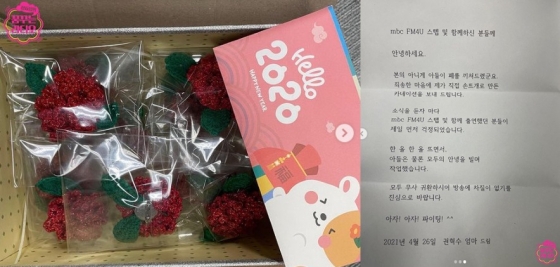 편지에는 "안녕하세요. 본의 아니게 아들이 폐를 끼쳐드렸군요. 죄송한 마음에 제가 직접 손뜨개로 만든 카네이션을 보내 드립니다"라며 "소식을 듣자마자 MBC FM4U 스태프 및 함께 출연했던 분들이 제일 먼저 걱정됐습니다"라고 말했다.