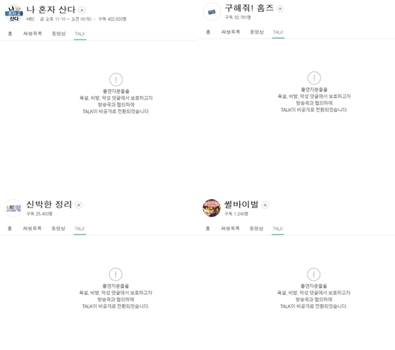 네이버 TV TALK은 방송과 관련해 댓글을 달수 있는 곳이다. 네이버는 "출연자분들을 욕설, 비방, 악성 댓글에서 보호하고자 방송국과 협의하에 비공개로 전환됐다"고 설명했다. 최근 출연자 박나래가 성희롱 논란으로 여론의 뭇매를 맞자 이같은 조치를 취한 것으로 보인다.