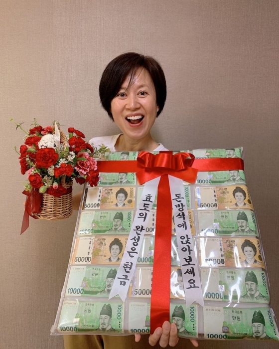 박미선은 8일 자신의 인스타그램에 "허허 자식 키운 보람있네 ㅎㅎ 돈방석을 선물 받을 줄이야 ㅋ 고맙다 딸 ,아들 세상의 모든 부모님들 감사합니다"라며 "#어버이날선물#돈방석#자식자렁#팔불출"이라는 글과 함께 사진을 게재했다.