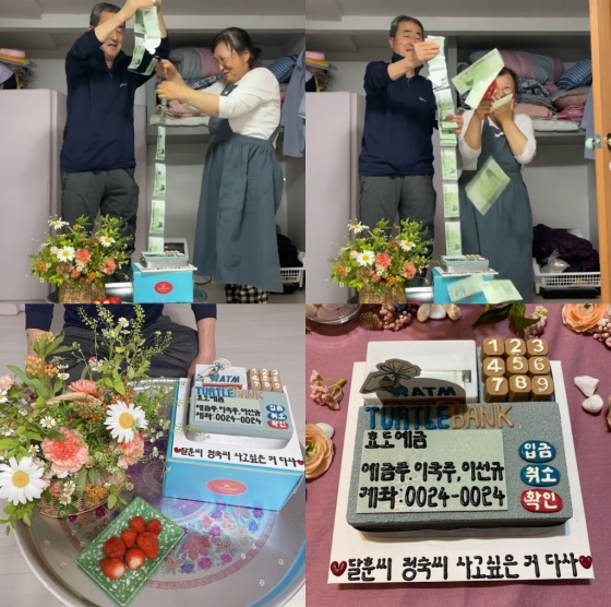 공개된 영상 속 이국주의 부모님은 케이크에서 나오는 돈을 보며 환하게 웃고 있다. 이어 '머니건'이라고 불리는 장난감 총에서 돈이 계속해서 나오는 것을 보고 크게 웃으며 기뻐했다.