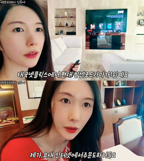 현지 코로나19 상황이 심각한 만큼 집에서 시간을 보내는 신주아는 "사실 심심하다"며 집콕 생활을 전했다. 이어 TV를 틀며 "태국 넷플릭스에서는 현재 '빈센조'가 1위"라며 "한국 드라마가 톱10안에 세 편이나 들어가있다"고 설명했다.