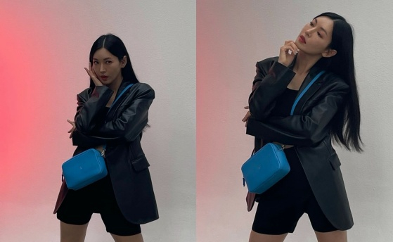 사진 속 김소연은 바지와 상의, 재킷 모두 검은색으로 입고 있다. 까만 머리카락과 빨간 입술은 김소연의 포스를 한 층 부각한다.