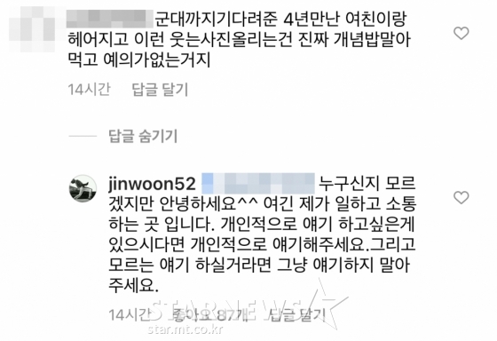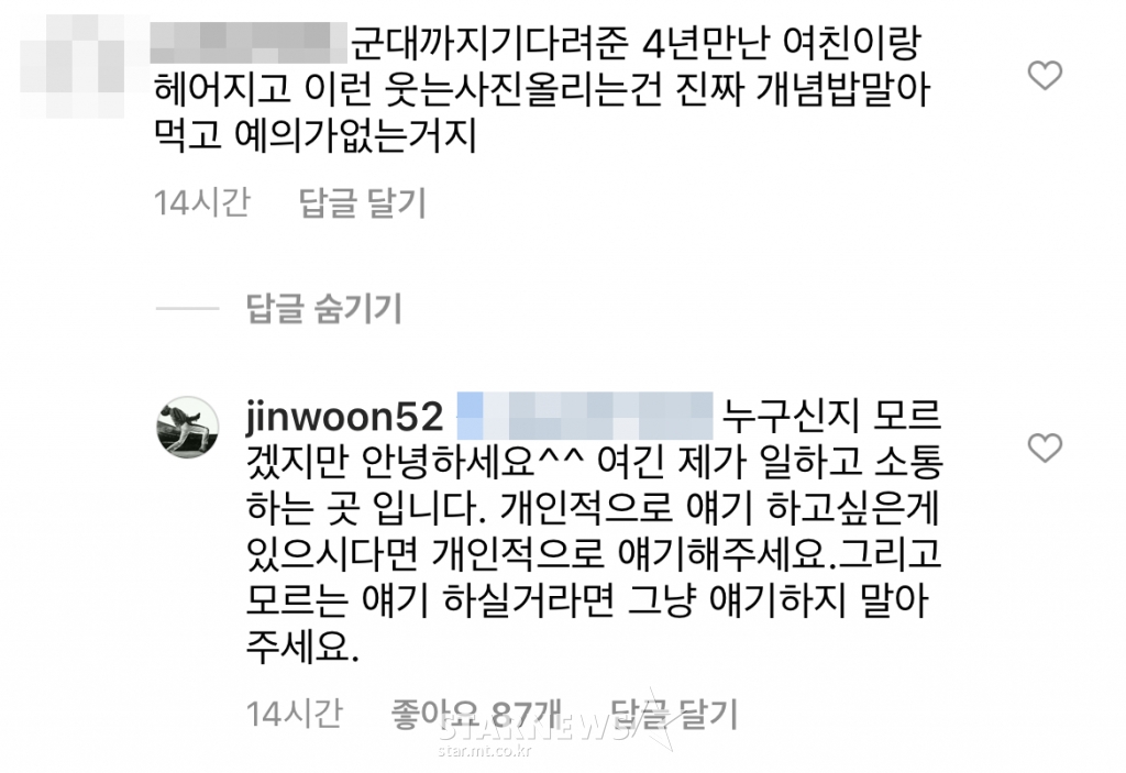 이를 본 한 네티즌이 "군대까지 기다려준 4년 만난 여친이랑 헤어지고 이런 웃는 사진 올리는 건 진짜 개념 밥 말아먹고 예의가 없는 거지"라고 댓글을 달았다.