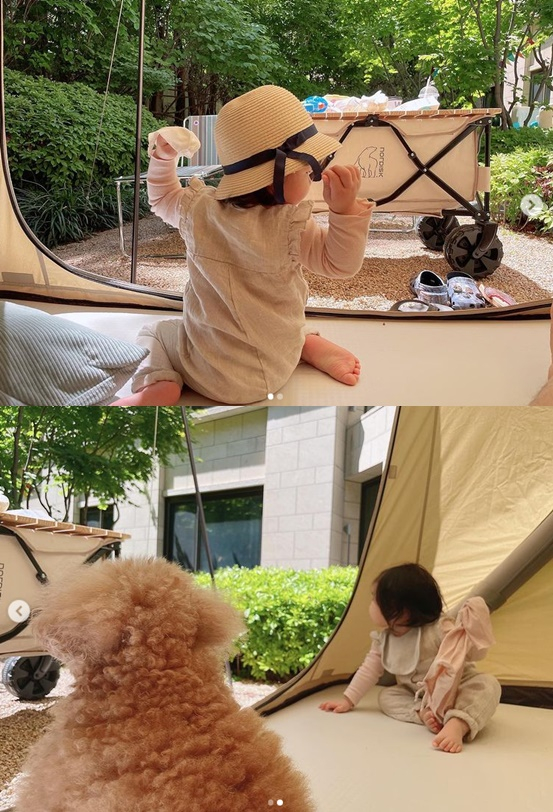 공개 된 사진 속 최지우는 2살이 된 딸과 즐거운 시간을 보내고 있다. 평소 최지우가 아끼는 반려견도 함께 하고 있다.
