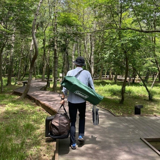 또 다른 사진 속에는 캠핑 용품을 들고 걸어가는 한지혜 남편의 뒷모습이 담겨 눈길을 끈다.