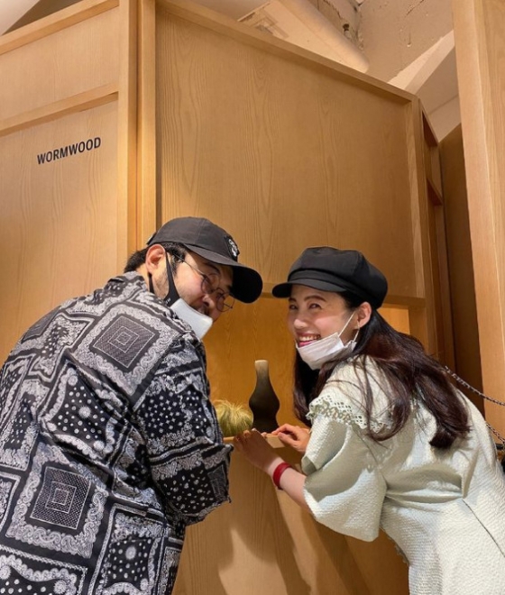 공개된 사진 속 김기방은 아내와 함께 익살스러운 표정을 지으며 카메라를 응시한다. 두 사람의 애정이 분홍빛 분위기를 자아낸다.