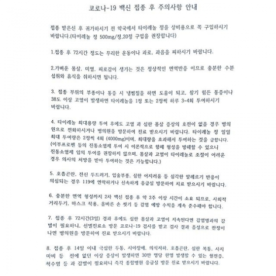 공개된 사진은 코로나19 백신 접종 후 주의사항 안내문이다. '접종 후 72시간 정도 무리한 운동이나 과로, 과음을 피하시기 바란다' 등의 안내사항이 적혀 있다.