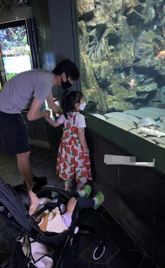 사진 속 정조국은 딸 손을 잡고 수족관 안을 바라보고 있다. 정조국은 딸과 눈높이를 맞춰 수족관을 바라보며 다정한 아빠의 모습을 보였다.