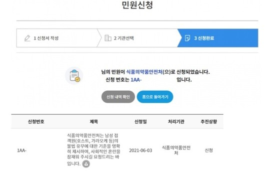 지난 1일 한 네티즌 A씨는 온라인 커뮤니티를 통해 "한예슬 남자친구를 보고 식약처에 남성 접객원(호스트, 가라오케) 관련 민원을 넣었다"라고 밝혔다.
