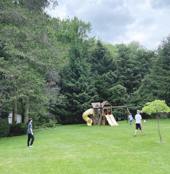 사진 속에는 손태영 아이들이 뛰놀고 있다. 아이 셋이 뛰어다녀도 될 만큼 넓은 정원이다.
