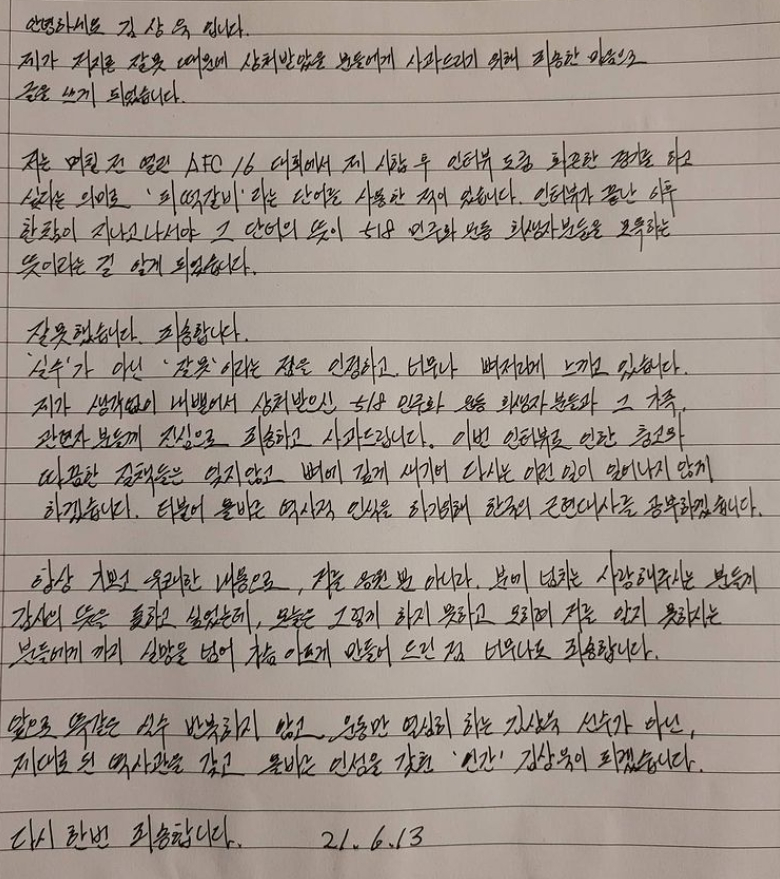앞으로 똑같은 실수 반복하지 않고, 운동만 열심히 하는 선수 김상욱이 아닌, 제대로 된 역사관을 갖추고 올바른 인성을 가진 인간 김상욱이 되겠습니다.
