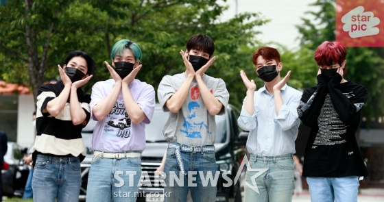 그룹 엔플라잉(N.Flying) 서동성, 김재현, 이승협, 유회승, 차훈이 17일 오후 서울 양천구 목동 SBS에서 진행되는 라디오 '컬투쇼' 출연을 위해 도착하고 있다. 2021.06.17