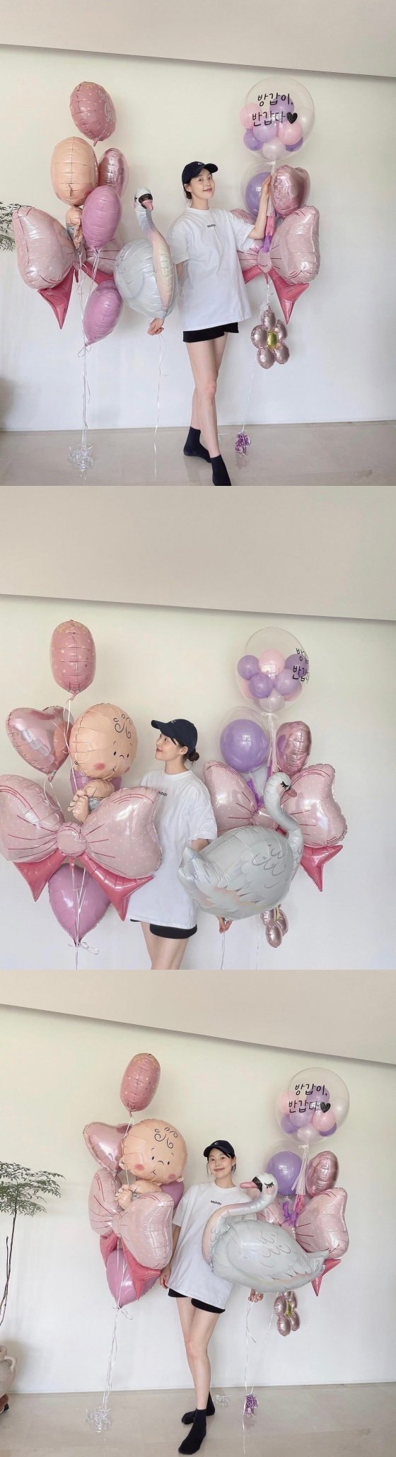 사진 속 한지혜는 '방갑이 반갑다'고 쓰인 풍선을 들고 있다. 출산을 3일 남긴 한지혜의 설레는 마음이 느껴진다.