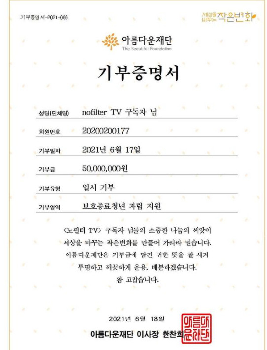 해당 증명서에는 "'노필터 TV' 구독자 님들의 소중한 나눔의 씨앗이 세상을 바꾸는 작은 변화를 만들어 가리라 믿는다"라며 "아름다운재단은 기부금에 담긴 귀한 뜻을 잘 새겨 투명하고 깨끗하게 운용, 배분하겠다"라는 말이 담겨있다.