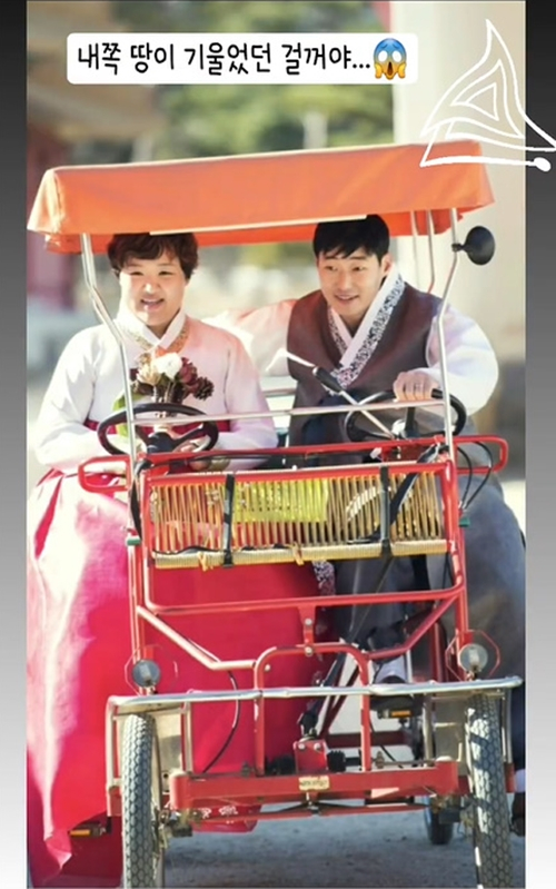 공개된 사진에는 한복을 입고 있는 하재숙과 남편의 웨딩 촬영 모습이 담겼다. 두 사람은 자전거를 탔으며, 하재숙 쪽으로 비스듬히 기울어져 있다. 이와 함께 사진에 '내 쪽 땅이 기울었던 걸꺼야'라는 문구가 담겨 있어 보는 이들에게 웃음을 선사했다.
