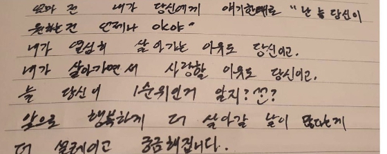 사진 속에는 김원효가 직접 쓴 손편지가 있다. 김원효는 '내가 열심히 살아가는 이유도 당신이고, 내가 살아가면서 사랑할 이유도 당신이고, 늘 당신이 1순위인 거 알지?'라는 말로 진심을 표현했다.