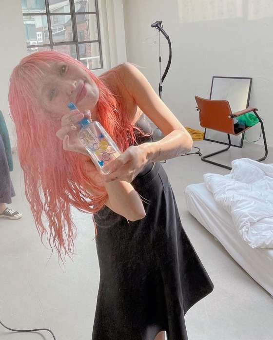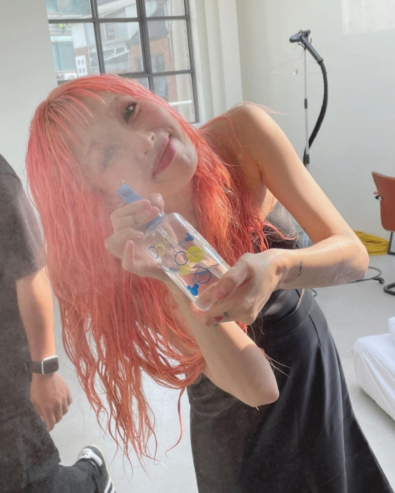 공개된 사진 속 현아는 화보 촬영을 하고 있는 모습. 그는 분홍색 머리를 적신 후 분무기를 카메라를 향해 뿌려 장난기를 방출했다.