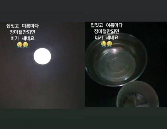 이지훈은 4일 인스타그램에 "집 짓고 여름마다 장마철만 되면 비가 새네요"라며 우는 이모티콘과 함께 영상을 게재했다.