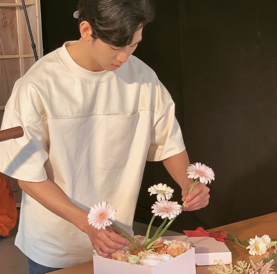 사진 속 김수현은 꽃으로 박스 안을 꾸미고 있다. 집중한 김수현의 얼굴이 눈에 들어온다. 오똑한 코와 날렵한 턱선은 조각을 연상시킨다. 김수현 손등의 핏줄과 넓은 어깨는 남자다운 느낌을 주며 반전 매력을 선물했다.