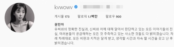권민아는 최근 자신의 SNS 계정 소개글에 "A씨(전 남자친구)와의 정확한 진실과 신 씨(신지민)와 저에 대해 알아서 판단하고 있는 모든 이야기들의 진실, 여러분들이 궁금해하는 모든 것 추측하고 있는 사소한 것들도 다 밝히겠다"라고 말했다.