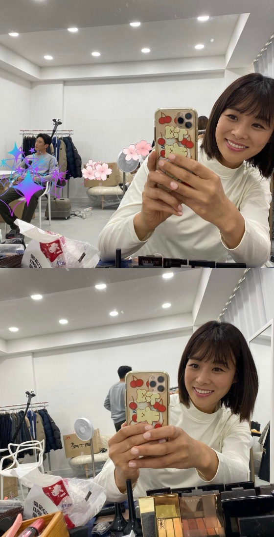 사진 속 장신영은 함께 화보 촬영하러 온 강경준 몰래 투샷을 찍고 있다. 강경준을 향한 장신영의 애정이 엿보인다. 이에 강경준은 장신영이 셀카 찍는 모습을 찍으며 알콩달콩한 시간을 보냈다.