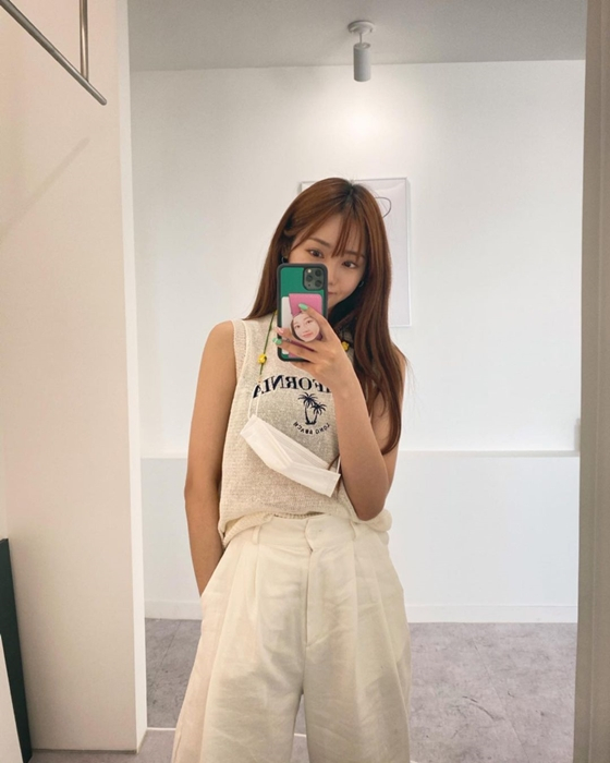 홍지윤은 22일 오후 자신의 인스타그램에 "흰바지 입은 날은.. 꼭 뭘 묻히는 마법^^. 칠칠이"라는 글과 사진을 게재했다.
