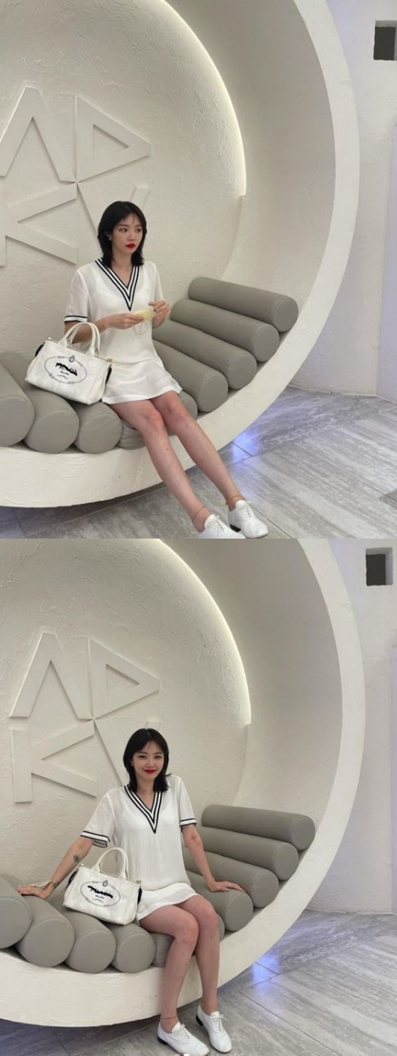사진 속에는 김새롬이 하얀색 상의와 하의, 구두, 가방을 입고 마린 룩을 연상시키는 모습으로 포즈를 취하고 있다.
