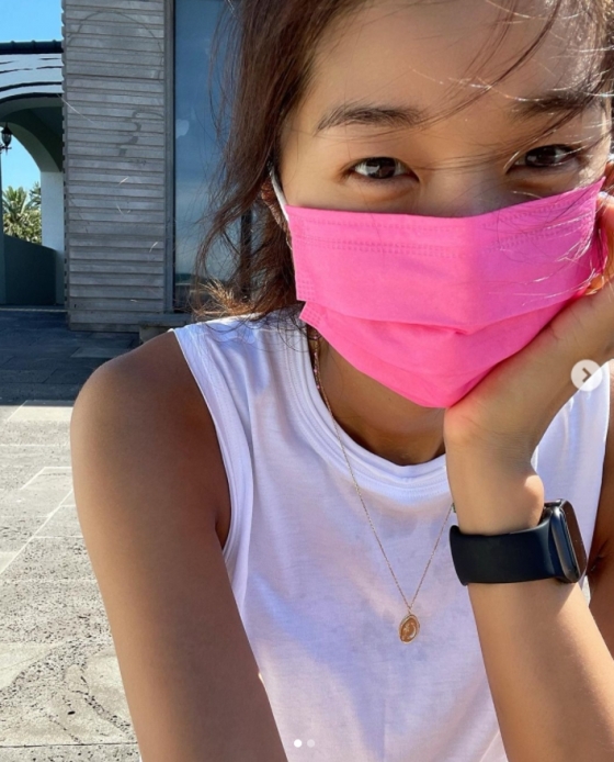공개된 사진 속 김빈우는 분홍색 마스크를 쓴 채 눈웃음을 짓고 있다. 그는 민소매 의상에 구릿빛 피부로 건강미를 발산했다. 김빈우는 "내 피부는 소중하니까"라며 선블럭을 홍보했다.