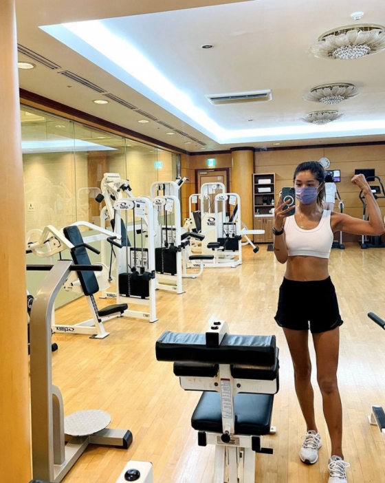 사진에서 김빈우는 헬스장에서 마스크를 쓴 채 거울을 바라보고 있다.