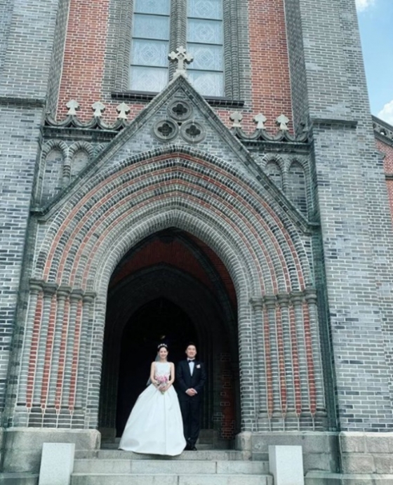 이영아는 웨딩드레스를 입고 부케를 들고 있고 남편은 턱시도를 입고 있다.