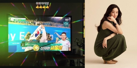 사진 속에는 도쿄 올림픽 기계체조 남자 도마 결선에서 금메달을 획득한 신재환의 모습이 담겨 있으며 정려원은 이를 축하하고 있다.