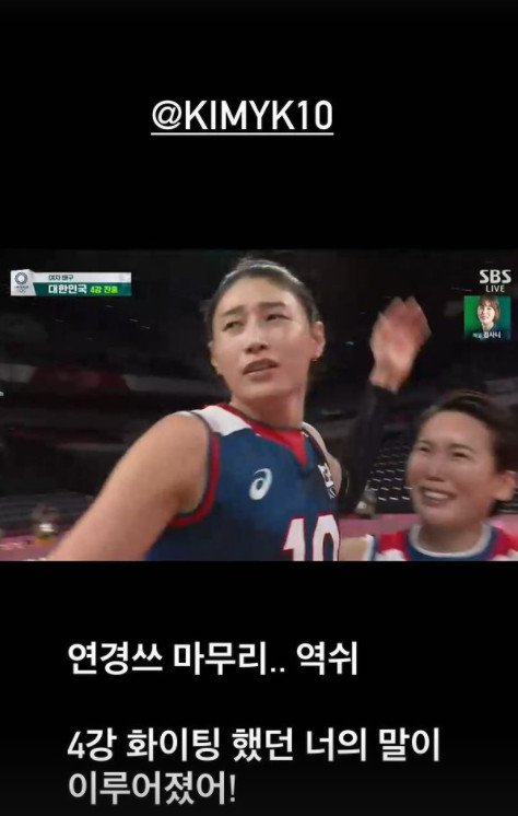 이어 "이번에 DM으로 종종 문자 주고받으면서 연경이가 응원해줘서 고맙다고 8강도 화이팅이라며.. 왔는데 난 우리 4강가보자 했더니. 연경쓰가 '4강 화이팅!' 이라고 너가 말한대로 그대로! 그리고 열심히 했으니 이루어졌어"라고 감격했다.