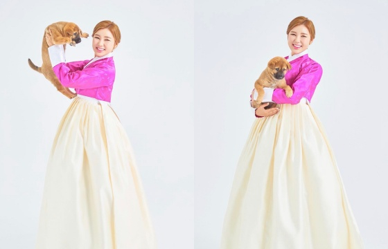 사진 속 한가인은 분홍색 저고리와 아이보리색 치마를 입고 화사한 미소를 뽐내고 있다. 그림 같이 고운 모습이다. 그에 반면 송가인 품에 안긴 황구 표정은 시무룩하다. 송가인의 미소와 황구의 표정인 대비돼 웃음을 자아낸다.
