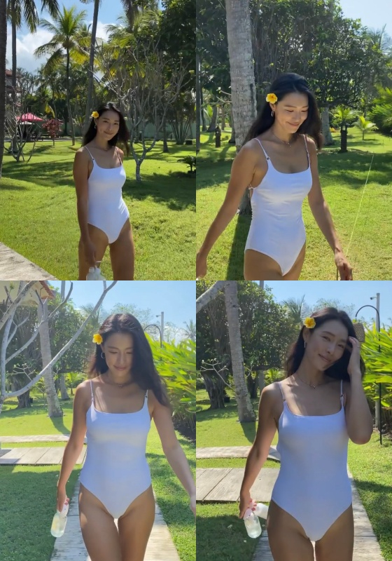 동영상 속 가희는 하얀 수영복을 입고 공원을 걷고 있다. 가희는 다리 라인이 모두 드러나는 하이 레그 수영복을 입고도 자신있게 걸으며 당당한 섹시함을 뽐냈다. 가희의 환한 미소는 발리의 청량함과 어우러진다.