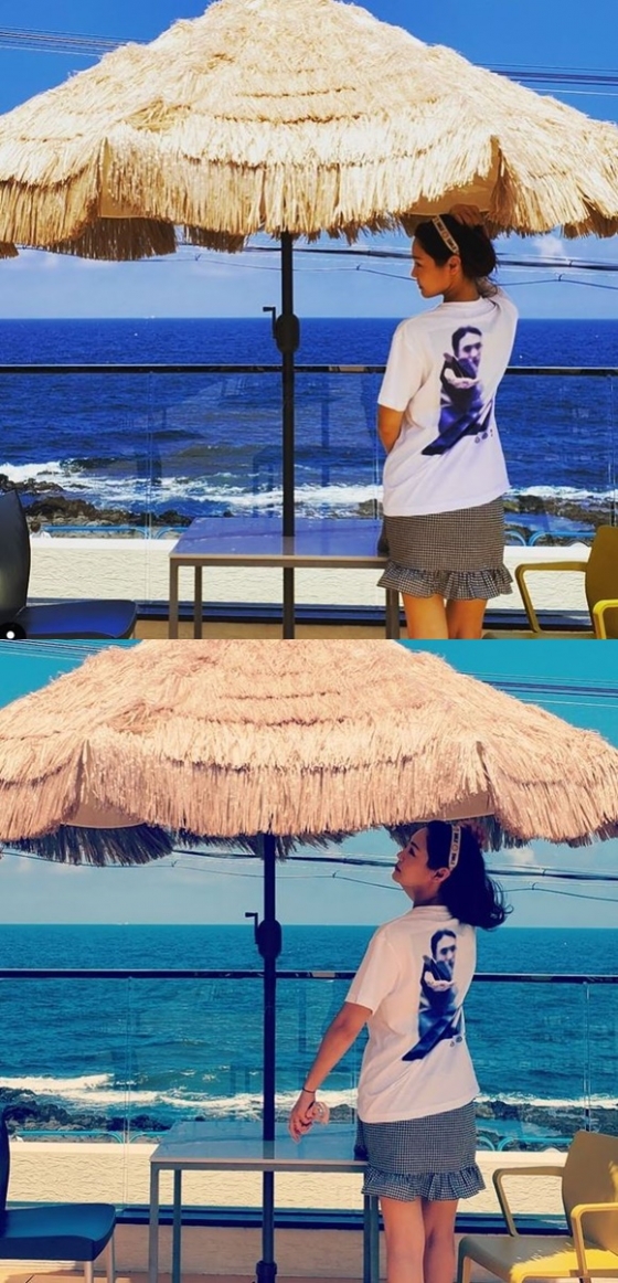 사진 속에는 안현모가 푸른 바다 앞 파라솔에서 휴가를 즐기는 모습이 담겨 있다.