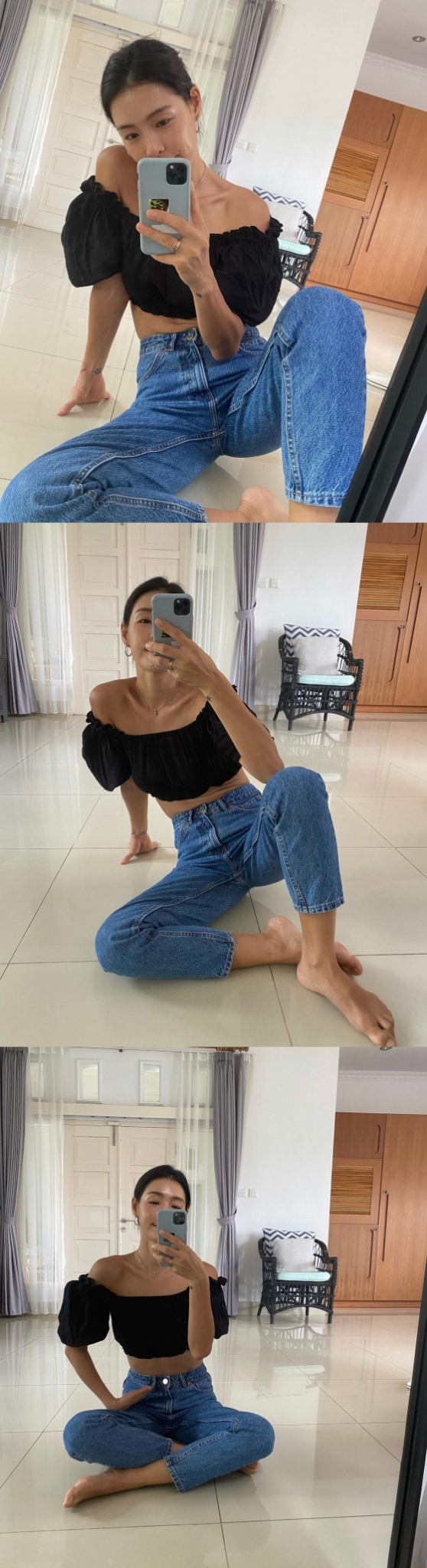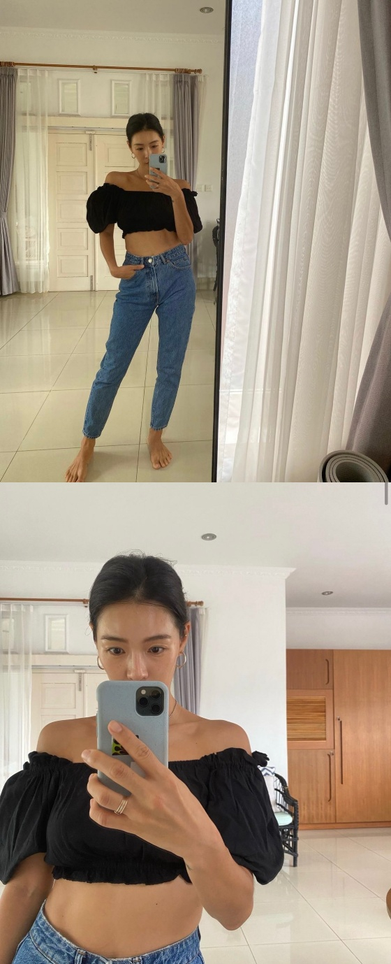 사진 속 가희는 오프숄더 크롭톱을 입고 있다. 가희는 허리를 굽히거나 바닥에 앉으며 배를 접었지만 여전히 탄탄한 복근을 자랑했다.