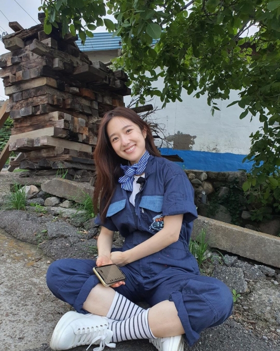 공개된 사진 속 이혜성은 LG헬로비전, 더라이프 예능 '우리동네 클라쓰' 촬영 도중 쉬는 모습. 그는 점프수트를 입고 해맑은 미소를 선보였다.