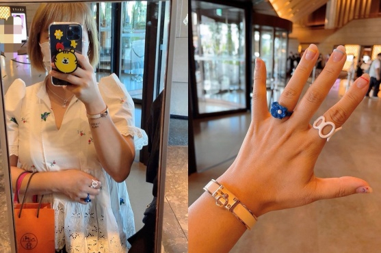 사진 속에는 김영희가 명품 H사 쇼핑백을 든 채 H사 팔찌를 차고 있다. 이 팔찌는 93만 원 상당의 고가 상품이다.